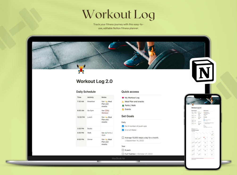 Track your fitness journey with this easy-to-use, editable Notion fitness planner.